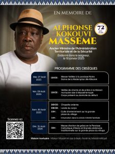 Le vendredi 29 août, aura lieu une veillée de chants et de prière à la maison mortuaire sise à Akato-Avoèmé au lieudit Massémé-kopé, avec corps présent.