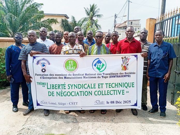 Au Syndicat national des travailleurs des sociétés d’entreprises des manutentions maritimes du Togo (SYNTRASEMTO), le bureau exécutif veut capaciter les membres à bien défendre leurs droits. Dans cette perspective, il a initié, ce lundi 8 décembre au siège de la Confédération syndicale des travailleurs du Togo (CSTT), une session de formation à leur endroit. Sur le thème « Liberté syndicale et technique de négociation collective ».