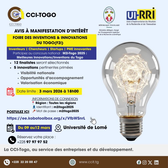 Dans cette perspective, la CCI-Togo a lancé, le jeudi 26 février 2026, un appel à manifestation d’intérêt à l’intention des inventeurs, chercheurs, étudiants porteurs de projets, start-ups et PME innovantes, afin d’identifier les projets les plus prometteurs. La date limite de dépôt des dossiers est fixée au 3 mars 2026 à 18 h 00.